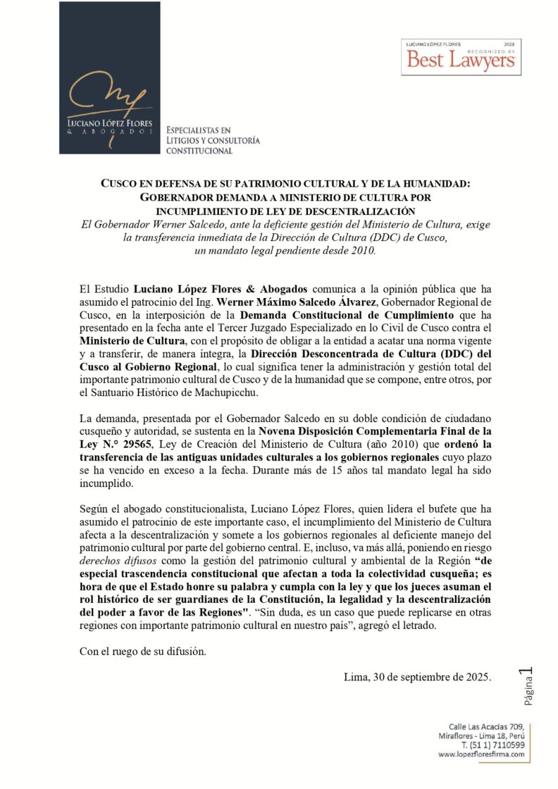 El Estudio Luciano López Flores & Abogados comunica a la opinión pública que ha asumido el patrocinio del Ing. Werner Máximo Salcedo Álvarez, Gobernador Regional de Cusco, en la interposición de la Demanda Constitucional de Cumplimiento que ha presentado en la fecha ante el Tercer Juzgado Especializado en lo Civil de Cusco contra el Ministerio de Cultura, con el propósito de obligar a la entidad a acatar una norma vigente y a transferir, de manera íntegra, la Dirección Desconcentrada de Cultura (DDC) del Cusco al Gobierno Regional, lo cual significa tener la administración y gestión total del importante patrimonio cultural de Cusco y de la humanidad que se compone, entre otros, por el Santuario Histórico de Machupicchu.