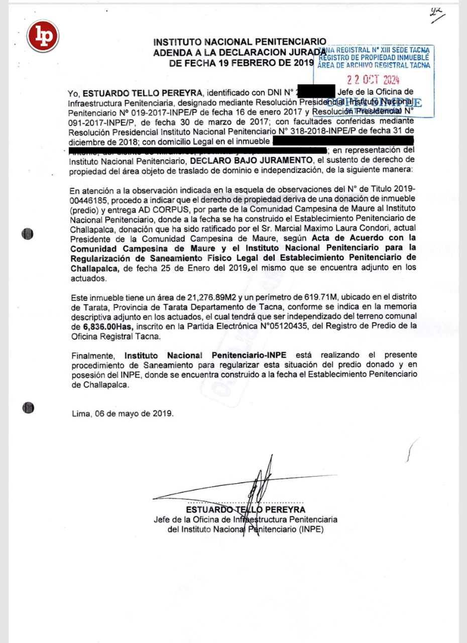 Nos encontramos frente a un documento, una declaración jurada, que tiene cualidad probatoria intrínseca y que lo empleó el INPE para presentarlo a los registros públicos para poder titular estas tierras donde se encuentra el penal. Esta declaración dice que estamos en posesión en mérito a una donación que ratificó el señor presidente de la comunidad, Marcial Laura, y él ha declarado públicamente en el programa Radio Uno indicando que no ha firmado ni ratificado ninguna donación.