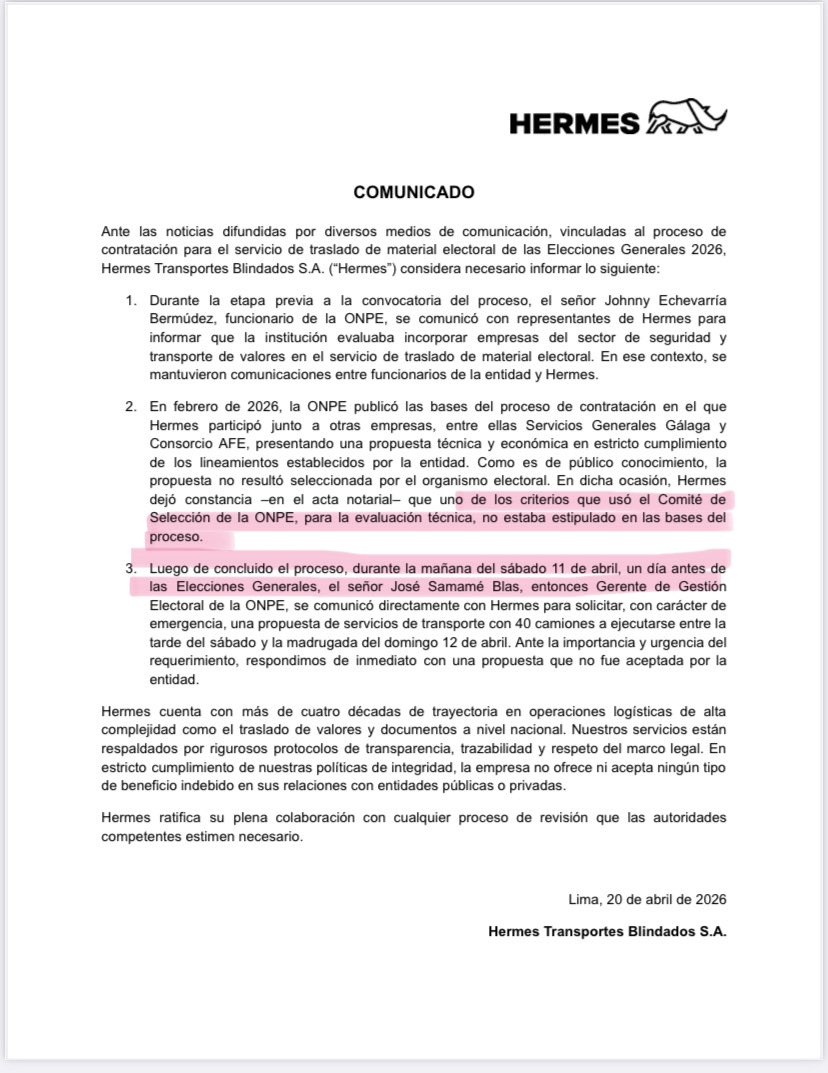 La empresa Hermes Transportes Blindados S. A. emitió un comunicado, este lunes 20, en el que detalló su participación en el proceso de contratación convocado por la Oficina Nacional de Procesos Electorales para el traslado de material electoral de las elecciones generales 2026. La compañía sostuvo que mantuvo contactos previos con funcionarios del organismo electoral y precisó que no fue la adjudicataria del servicio, pese a haber presentado propuesta técnica y económica junto con otras empresas del sector.