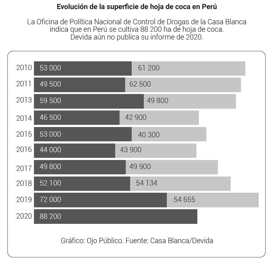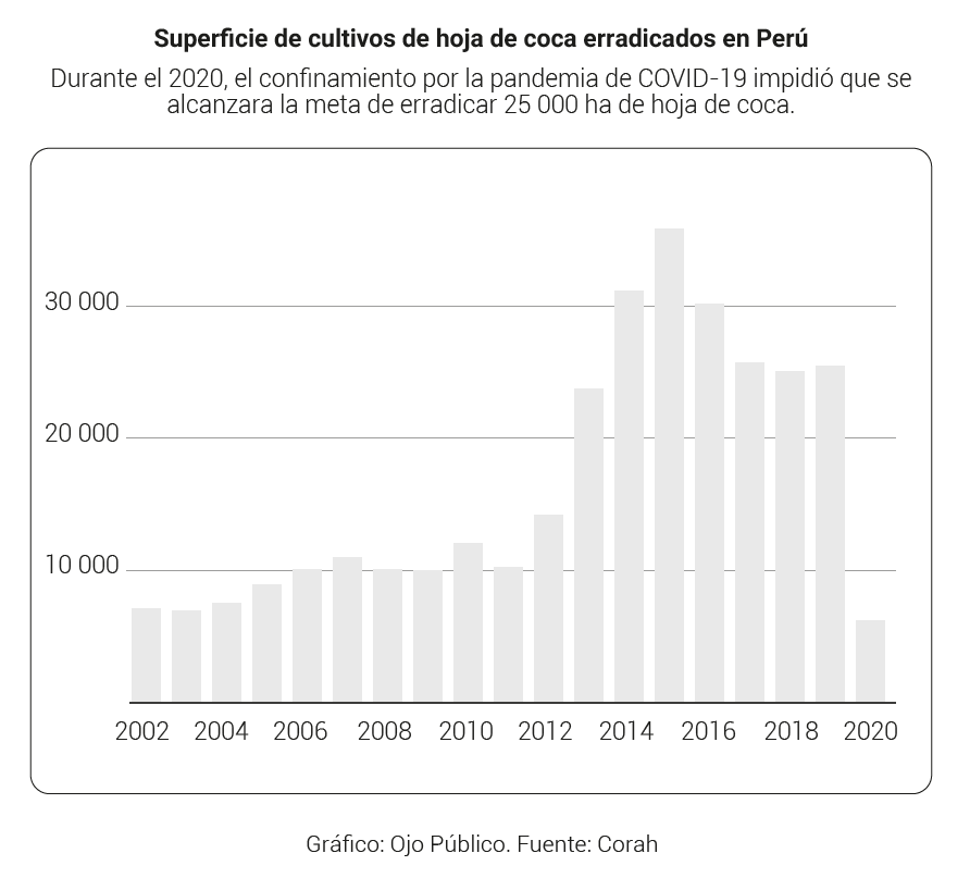 Mostramos esta gráfica elaborada por El Foco. Luego de haber llegado a erradicar unas 35 000 hectáreas en 2015, la cifra fue bajando hasta unas 25 000 en 2019. En 2020, como producto de la pandemia, solo se erradicaron algo más de 6000 hectáreas, y en lo que va de 2021 no se ha llegado a las 1000 hectáreas, a pesar de que el Plan para el 2021 involucraba la erradicación de 25 000.