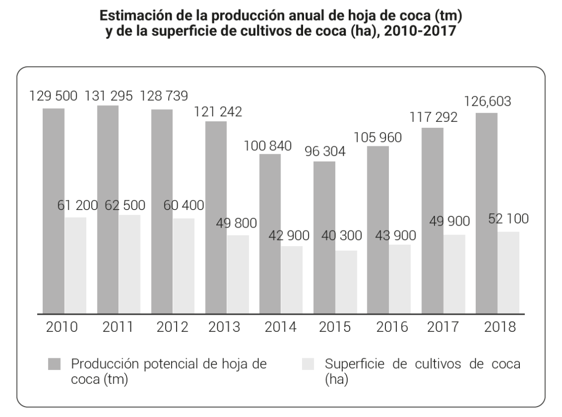 En la actualidad, podemos observar una tendencia al crecimiento de la cantidad de hectáreas en las que se produce hoja de coca y también una drástica reducción de las áreas erradicadas, por lo que no es absurdo suponer que existe cada vez más hoja disponible para la producción de droga toda vez que el consumo tradicional e industrial no ha crecido.