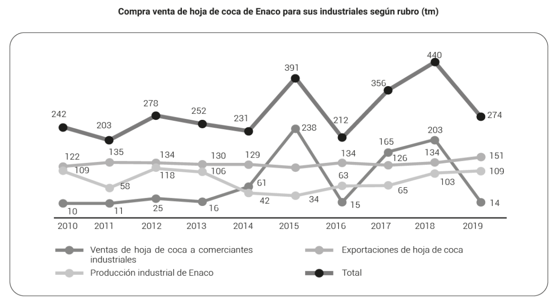 Como se advierte del gráfico que se publica en el informe de Devida, el tope de hoja de coca adquirida para todos estos usos industriales y para exportación alcanzó un máximo de 440 toneladas.