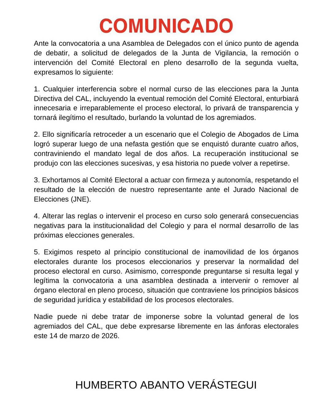 A través de un comunicado, señaló que cualquier intervención en el desarrollo de los comicios podría afectar la institucionalidad del CAL y desconocer la voluntad de los agremiados. En ese sentido, exhortó a respetar la autonomía del órgano electoral y a garantizar que el proceso continúe sin alteraciones hasta la jornada electoral prevista para el 14 de marzo de 2026.