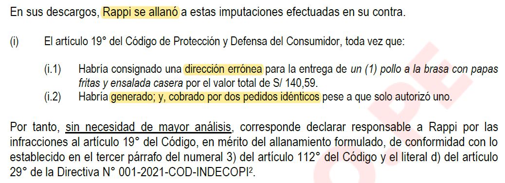 Durante el procedimiento, Rappi se allanó parcialmente a los cargos relacionados con la dirección errónea y el cobro duplicado. Por ello, el Indecopi declaró a la empresa responsable en esos extremos y le impuso dos amonestaciones.