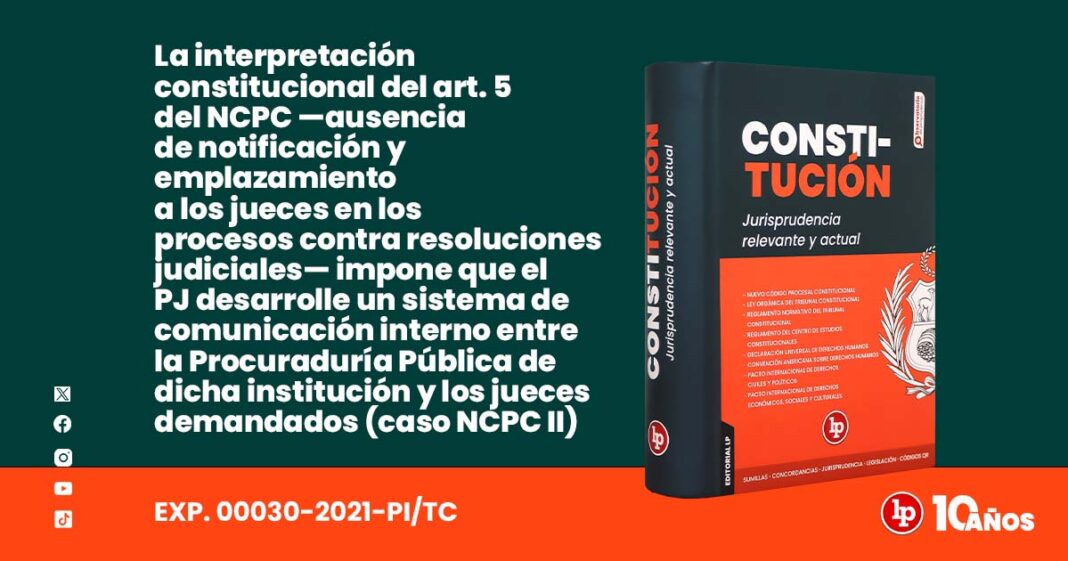 3. INTERPRETAR que el artículo 5 del Código Procesal Constitucional es constitucional al no impedir que el Poder Judicial desarrolle un sistema de comunicación interno entre la Procuraduría Pública de dicho poder del Estado y los jueces demandados vía procesos de tutela contra resoluciones judiciales, a efectos de que tomen conocimiento oportuno de dichos procesos, sin afectar la celeridad procesal ni las garantías del debido proceso.