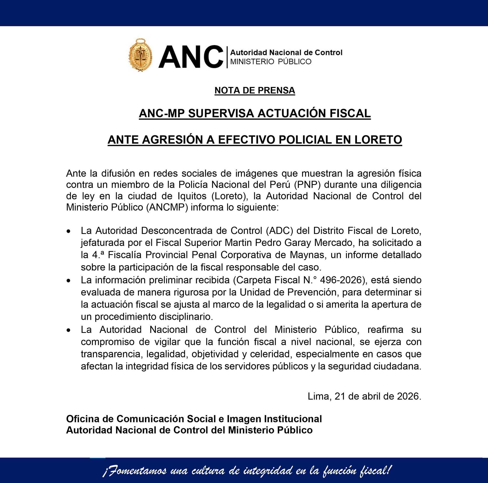 La Autoridad Nacional de Control del Ministerio Público señaló que continuará con el seguimiento del caso, reiterando que su función es garantizar que las actuaciones fiscales se desarrollen conforme a los principios de legalidad, objetividad, transparencia y celeridad.