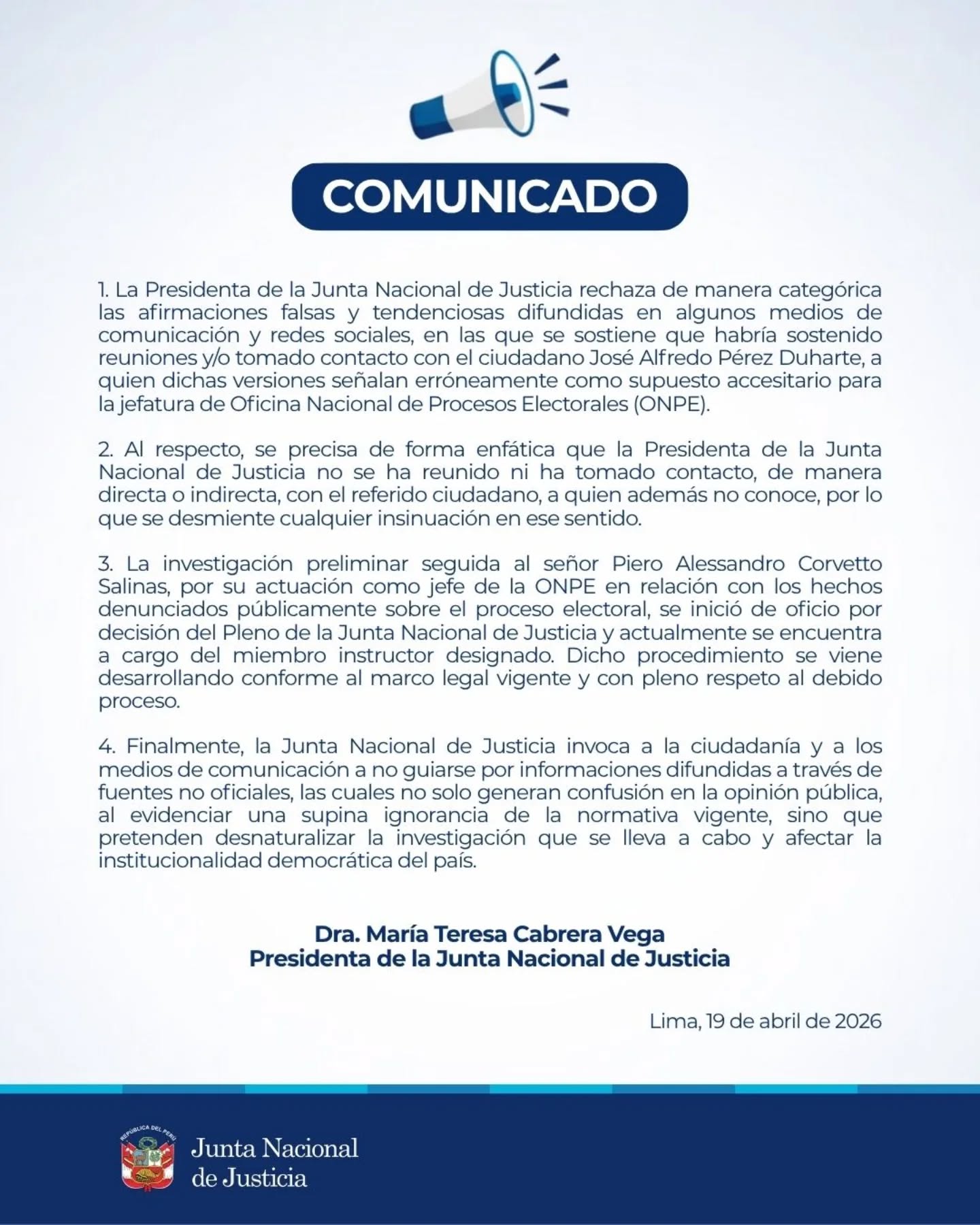 1. La Presidenta de la Junta Nacional de Justicia rechaza de manera categórica las afirmaciones falsas y tendenciosas difundidas en algunos medios de comunicación y redes sociales, en las que se sostiene que habría sostenido reuniones y/o tomado contacto con el ciudadano José Alfredo Pérez Duharte, a quien dichas versiones señalan erróneamente como supuesto accesitario para la jefatura de Oficina Nacional de Procesos Electorales (ONPE).
