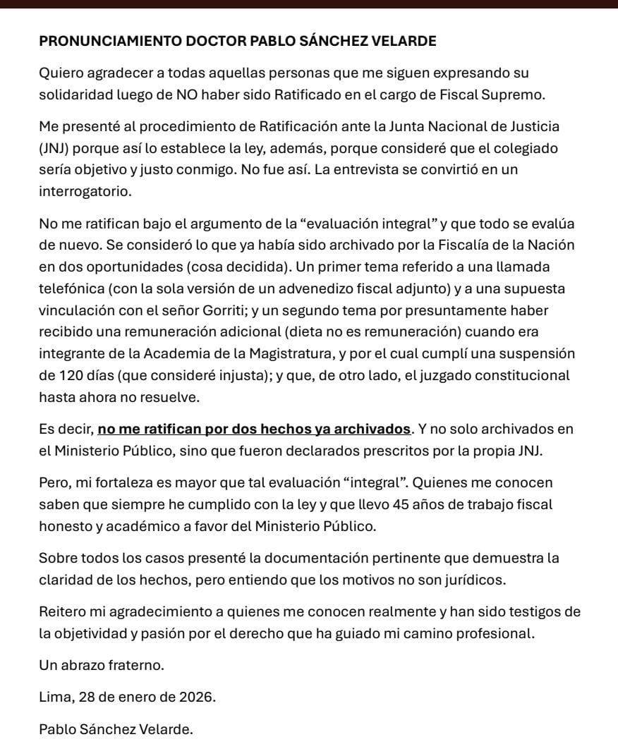 En su pronunciamiento, Sánchez Velarde afirmó que la JNJ no lo ratificó por “dos hechos ya archivados” por el Ministerio Público y declarados prescritos por la propia Junta. “Los motivos no son jurídicos”, sostuvo.
