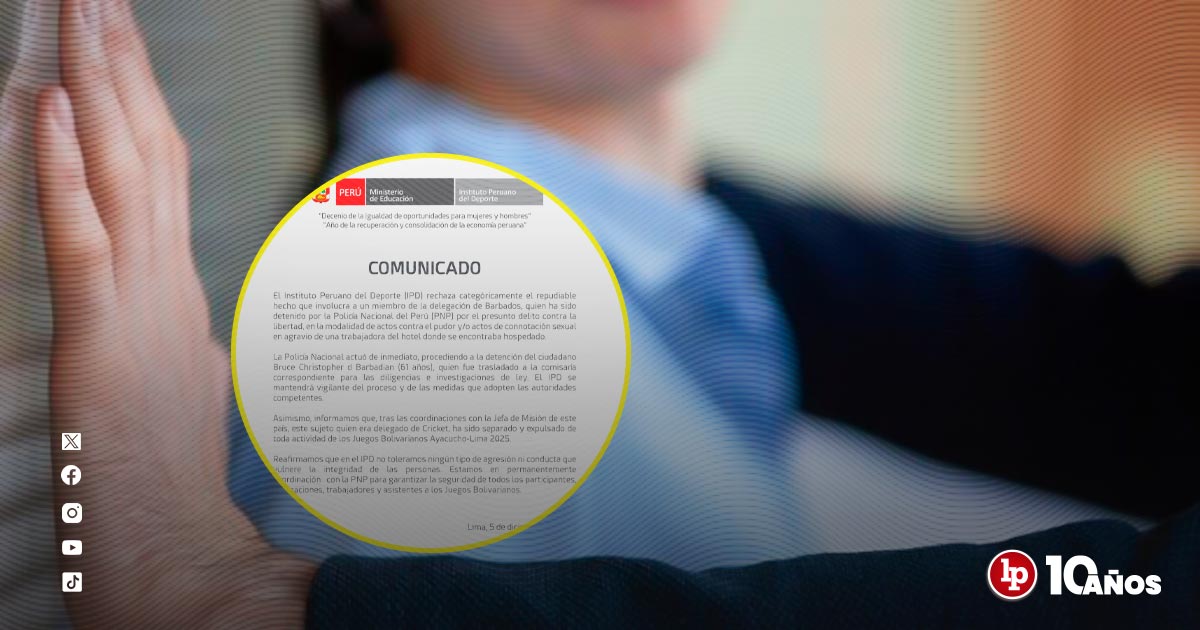 El Instituto Peruano del Deporte (IPD) rechaza categóricamente el repudiable hecho que involucra a un miembro de la delegación de Barbados, quien ha sido detenido por la Policía Nacional del Perú (PNP) por el presunto delito contra la libertad, en la modalidad de actos contra el pudor y/o actos de connotación sexual en agravio de una trabajadora del hotel donde se encontraba hospedado.