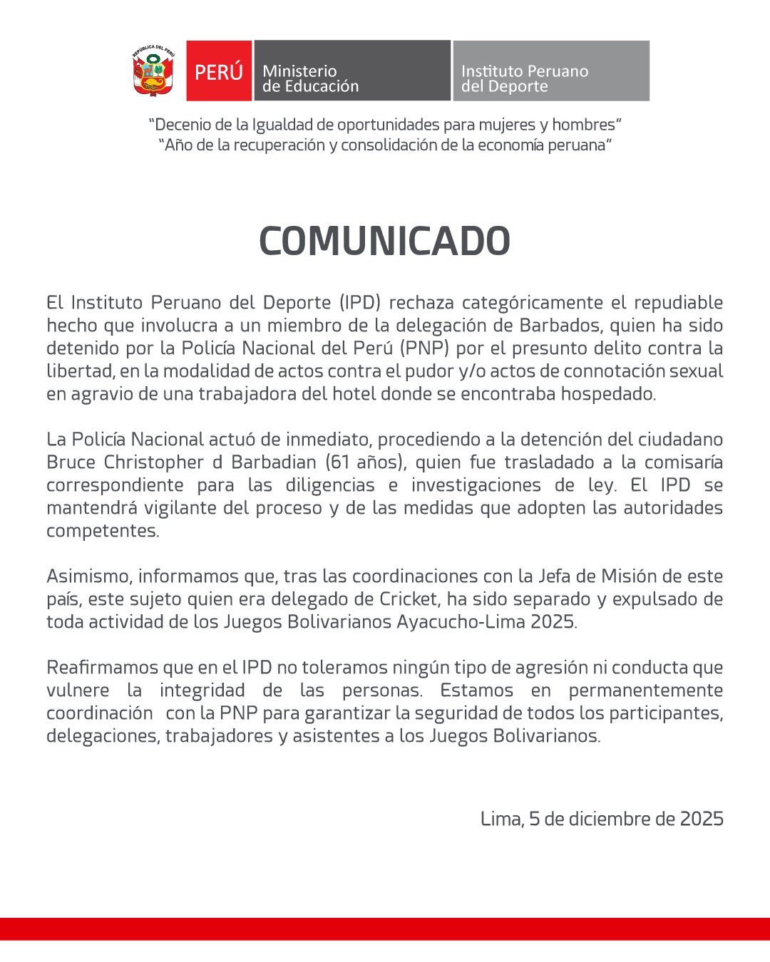 El IPD informó además que, tras coordinar con la Jefa de Misión de Barbados, el delegado, quien integraba el equipo de cricket, fue separado de forma definitiva de toda participación en los Juegos Bolivarianos y expulsado de las actividades oficiales del evento. La institución reiteró que no tolerará ningún tipo de agresión ni conducta que atente contra la integridad de personas vinculadas a la competencia.