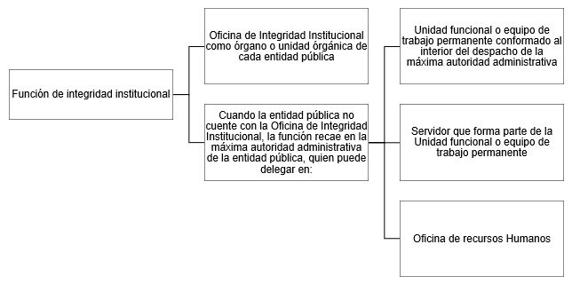 Las unidades de organización que ejercen la función de integridad cuentan con un Oficial de Integridad. El Oficial de Integridad tiene por función principal impulsar la implementación del modelo de integridad pública y articular esfuerzos en la promoción de la integridad y lucha contra la corrupción dentro de la entidad a la que pertenece. Cuando la entidad cuente con una Oficina de Integridad Institucional, el Oficial de Integridad es el titular de la Oficina de Integridad Institucional. Cuando la entidad no cuente con una Oficina de Integridad Institucional, el cargo de Oficial de Integridad recae en la máxima autoridad administrativa o en los que esta delegue, sin que ello implique la delegación de la responsabilidad[14].