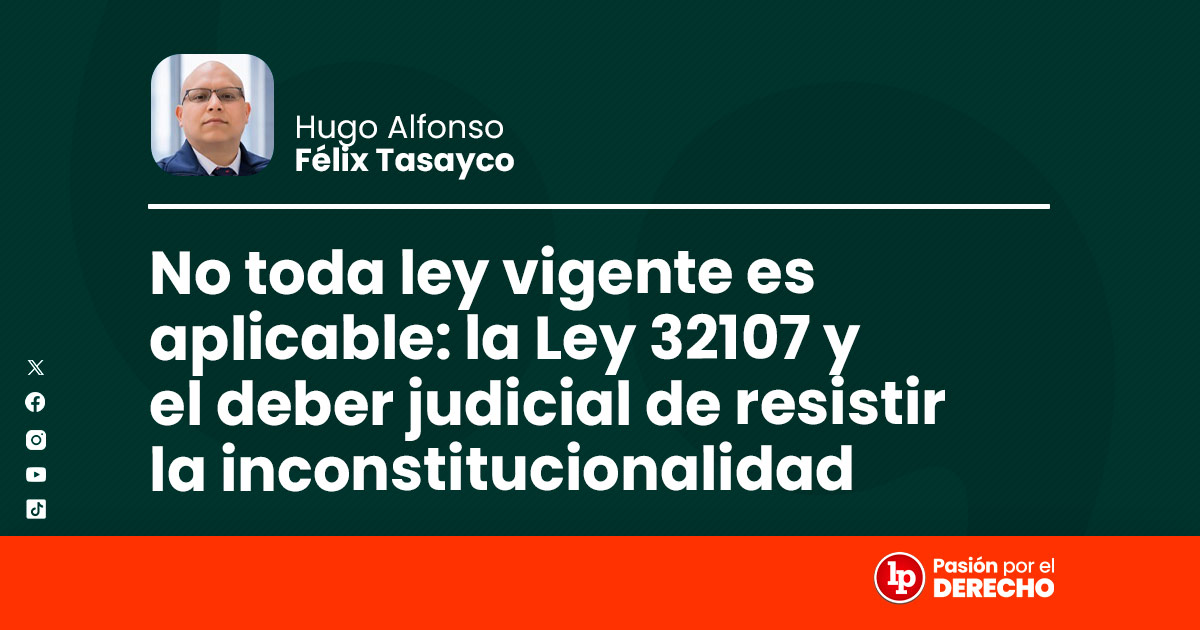 Desde mi perspectiva y bajo una exégesis integradora, se colige que el criterio adoptado por el magistrado Jorge Chávez Tamariz no solo resiste cualquier test de constitucionalidad, sino que se erige como una decisión institucionalmente necesaria que merece una validación dogmática categórica. Sostener la aplicación irrestricta de la Ley 32107, ignorando sus antinomias insalvables con la Norma Fundamental y el corpus iuris convencional, constituye una postura jurídicamente insostenible y de una regresividad normativa alarmante. Tal pretensión reduciría el ordenamiento a un legalismo paleopositivista, donde la vigencia formal de la norma prevalecería fraudulentamente sobre su validez sustancial.