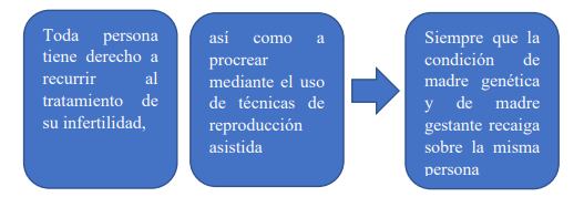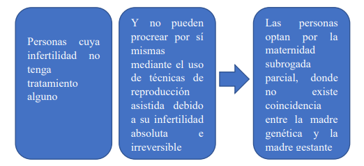 49. Es en ese contexto, de personas con la condición de infertilidad que a través de un tratamiento puedan procrear o utilizando las técnicas de reproducción asistida, que el legislador ha restringido la utilización de estas técnicas de la siguiente forma: “(…) siempre que la condición de madre genética y de madre gestante recaiga sobre la misma persona”. En este sentido, cuando se tratare de una mujer con infertilidad y que pretenda procrear mediante las técnicas de reproducción asistida no podrá recurrir a la ovodonación (donación de óvulos) pues no existirá la coincidencia requerida entre madre genética y madre gestante; es decir, en estos casos resulta obligatorio que la mujer que aporta la carga genética y la que gesta deben ser la misma persona. En ese sentido, las referidas personas se encuentran impedidas de recurrir a la gestación subrogada o cualquier otro método donde la madre genética y la madre gestante no recaigan en la misma mujer. Con mayor razón, se entiende que se encuentra prohibida la gestación subrogada para aquellas mujeres sin problemas de infertilidad y que, por razones estéticas, laborales, temor al embarazo, al dolor del parto, “mejoramiento” o manipulación de un patrón genético, etc., no deseen llevar su propio proceso de gestación o no quieren engendrar, gestar y alumbrar un bebé.