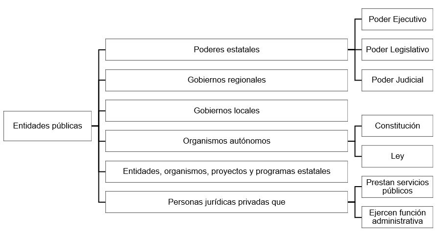 “Para los fines de la presente Ley, se entenderá por “entidad” o “entidades” de la Administración Pública: 1. El Poder Ejecutivo, incluyendo Ministerios y Organismos Públicos; 2. El Poder Legislativo; 3. El Poder Judicial; 4. Los Gobiernos Regionales; 5. Los Gobiernos Locales; 6. Los Organismos a los que la Constitución Política del Perú y las leyes confieren autonomía. 7. Las demás entidades, organismos, proyectos especiales, y programas estatales, cuyas actividades se realizan en virtud de potestades administrativas y, por tanto, se consideran sujetas a las normas comunes de derecho público, salvo mandato expreso de ley que las refiera a otro régimen; y, 8. Las personas jurídicas bajo el régimen privado que prestan servicios públicos o ejercen función administrativa, en virtud de concesión, delegación o autorización del Estado, conforme a la normativa de la materia”.