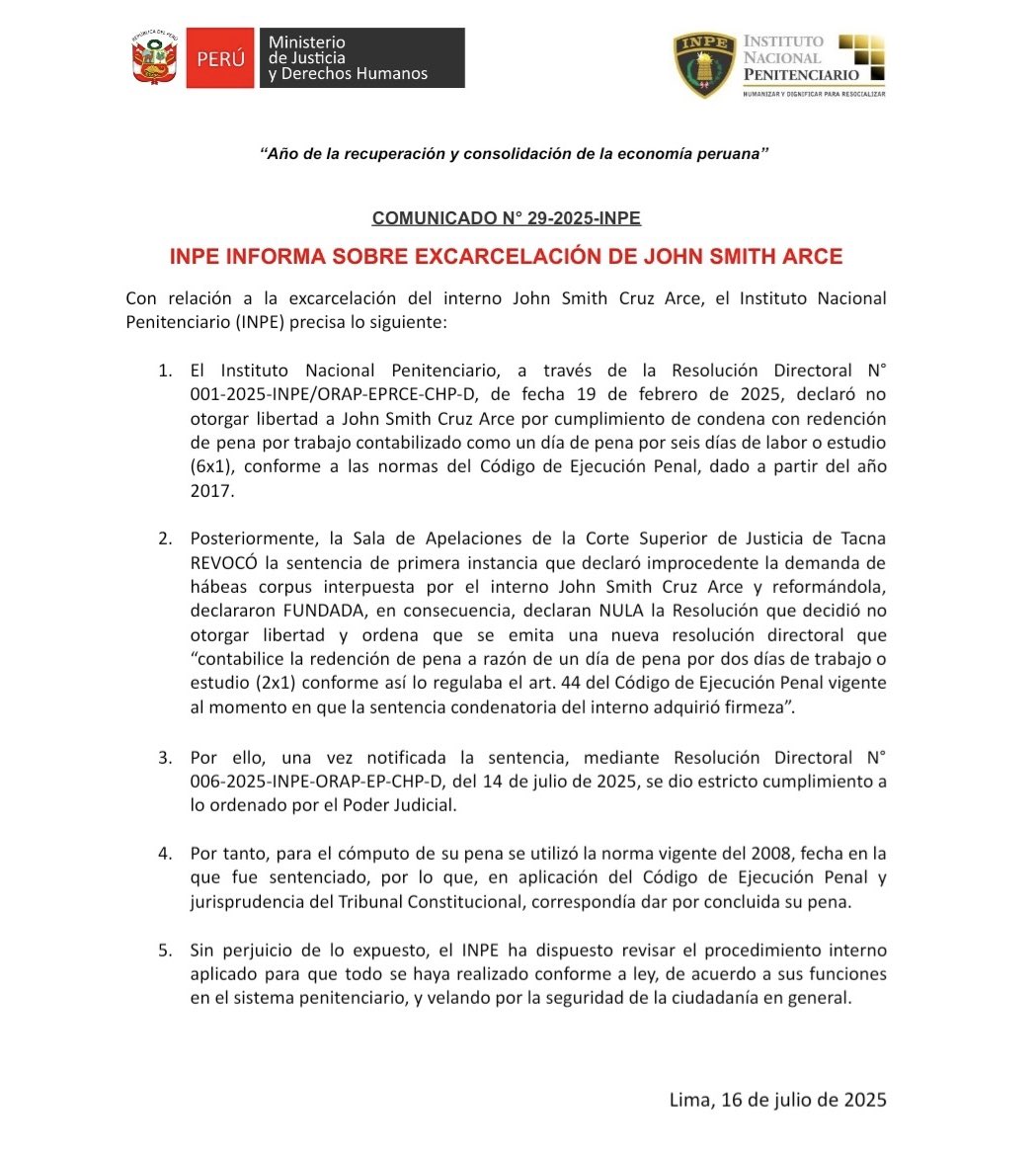 El Instituto Nacional Penitenciario (INPE) emitió un comunicado, este miércoles 16, horas más tarde que la Corte Superior de Tacna, en el marco de los cuestionamientos por la excarcelación de Jhon Smith Cruz Arce, sindicado como el líder de la organización criminal Los Pulpos, quien salió libre tras cumplir 17 años de prisión.