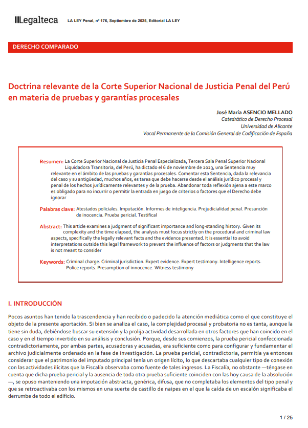 Resumen: La Corte Superior Nacional de Justicia Penal Especializada, Tercera Sala Penal Superior Nacional Liquidadora Transitoria, del Perú, ha dictado el 6 de noviembre de 2023, una Sentencia muy relevante en el ámbito de las pruebas y garantías procesales. Comentar esta Sentencia, dada la relevancia del caso y su antigüedad, muchos años, es tarea que debe hacerse desde el análisis jurídico procesal y penal de los hechos jurídicamente relevantes y de la prueba. Abandonar toda reflexión ajena a este marco es obligado para no incurrir o permitir la entrada en juego de criterios o factores que el Derecho debe ignorar.