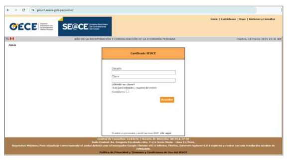 En la pantalla de inicio de sesión, el sistema le solicitará ingresar su Certificado Seace (usuario y contraseña).