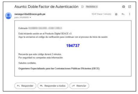 Ubique el correo con el asunto “Doble factor de autenticación”, donde encontrará el código de verificación que le permitirá continuar con el proceso de inicio de sesión.