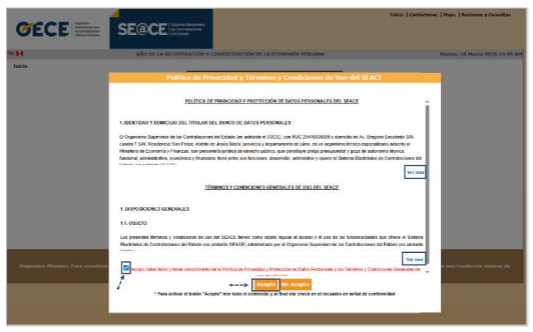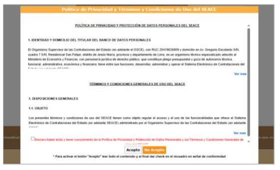 Puede acceder a cada uno pulsando el botón «Ver más», ubicado debajo de cada texto. Una vez que haya leído y comprendido ambos textos, marque la casilla: «Declaro haber leído y tener conocimiento de la Política de Privacidad y Protección de Datos Personales y los Términos y Condiciones Generales de Uso del SEACE». Al hacerlo, se activará el botón «Acepto», permitiéndole ingresar a la plataforma.