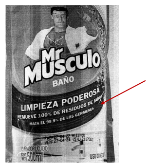 (i) En junio de 2023, actualizó el empaque del producto “limpiador líquido – baño limpia sarro y suciedades difíciles “Mr. Músculo – 500ml”[7], en el que informaba (al reverso) que “remueve el 99.9% de los gérmenes”, precisando las cepas de gérmenes que habían sido testeadas. En ese sentido, se consignó que se había verificado la eficacia del referido producto respecto de lo siguiente: (i) bacterias: S. entérica, P. aeruginosa, S. aerus, E. coli, E. hirae; (ii) virus: influenza (AH1N1), Norovirus; y, (iii) hongos: C. albicans.