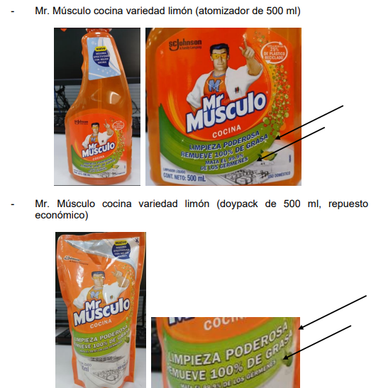 (i) Habría difundido publicidad en empaque del producto “Mr. Músculo cocina variedad limón, en presentación con atomizador de 500 ml”, con las siguientes afirmaciones: “limpieza poderosa remueve 100% grasa” y “mata el 99.9% de los gérmenes”, dando a entender que el producto sería: a) un limpiador con la capacidad de remover el 100% de todas las grasas presentes en el ambiente de la cocina; y, b) un limpiador líquido con capacidad de eliminar el 99.9% de todos los gérmenes presentes en el ambiente de la cocina; cuando en realidad dichos mensajes no serían ciertos.