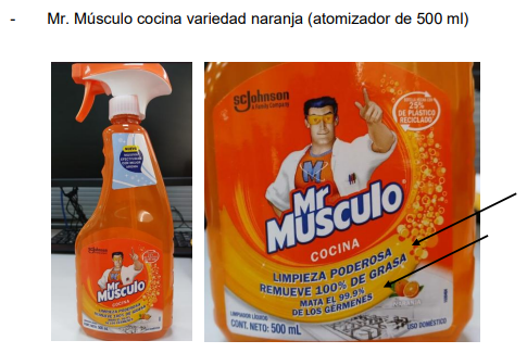 (iii) Habría difundido publicidad en empaque del producto “Mr. Músculo cocina variedad naranja, en presentación con atomizador de 500 ml, repuesto económico”, con las mismas afirmaciones, dando a entender que tal producto sería: a) un limpiador con la capacidad de remover el 100% de todas las grasas presentes en el ambiente de la cocina; y, b) un limpiador líquido con capacidad de eliminar el 99.9% de todos los gérmenes presentes en el ambiente de la cocina; cuando dichos mensajes no serían ciertos.