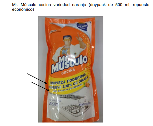 (ii) Habría difundido publicidad en empaque del producto “Mr. Músculo cocina variedad limón, en presentación doypack de 500 ml, repuesto económico”, con las mismas afirmaciones dando a entender que dicho producto sería: a) un limpiador con la capacidad de remover el 100% de todas las grasas presentes en el ambiente de la cocina; y, b) un limpiador líquido con capacidad de eliminar el 99.9% de todos los gérmenes presentes en el ambiente de la cocina; cuando dichos mensajes no serían ciertos.