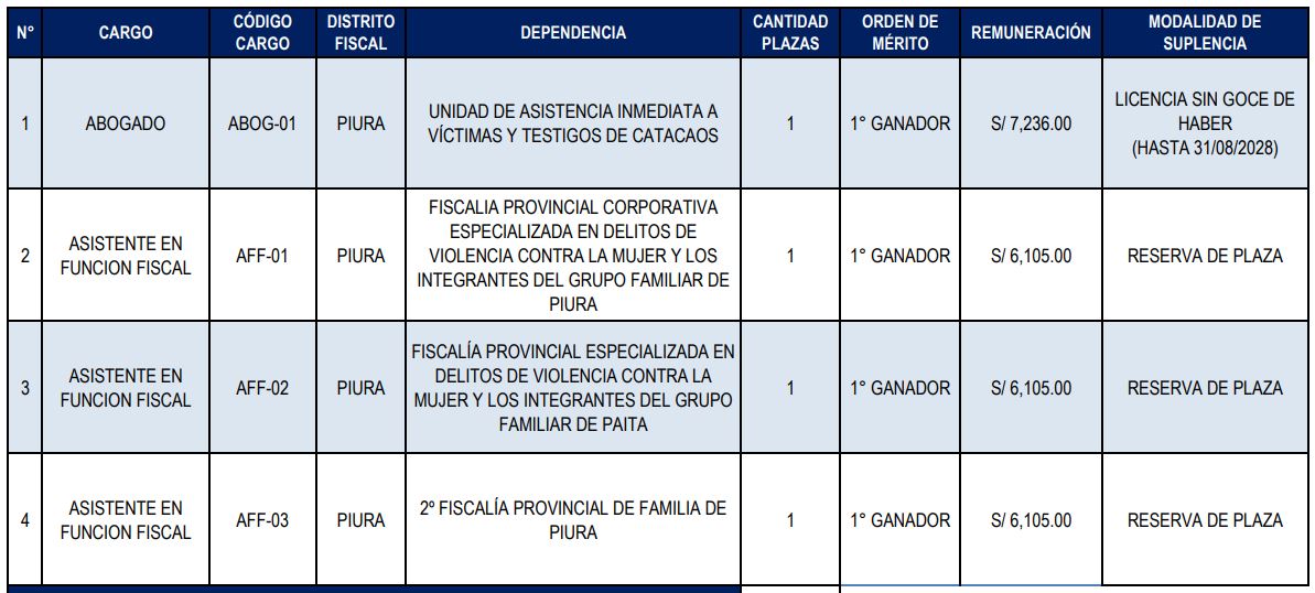 CONCURSO PUBLICO DE MERITOS POR SUPLENCIA N° 002-2025-MP-FN-UE PIURA CONTRATACIÓN DE CUATRO (04) PERSONAS PARA EL DISTRITO FISCAL DE PIURA