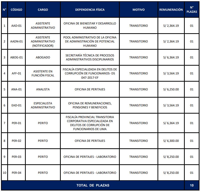 El Ministerio Público lanza convocatorias para cubrir 53 plazas en diferentes distritos fiscales a nivel nacional, a las que pueden postular personas con secundaria completa, estudiantes, egresados, bachilleres y profesionales de distintas carreras.