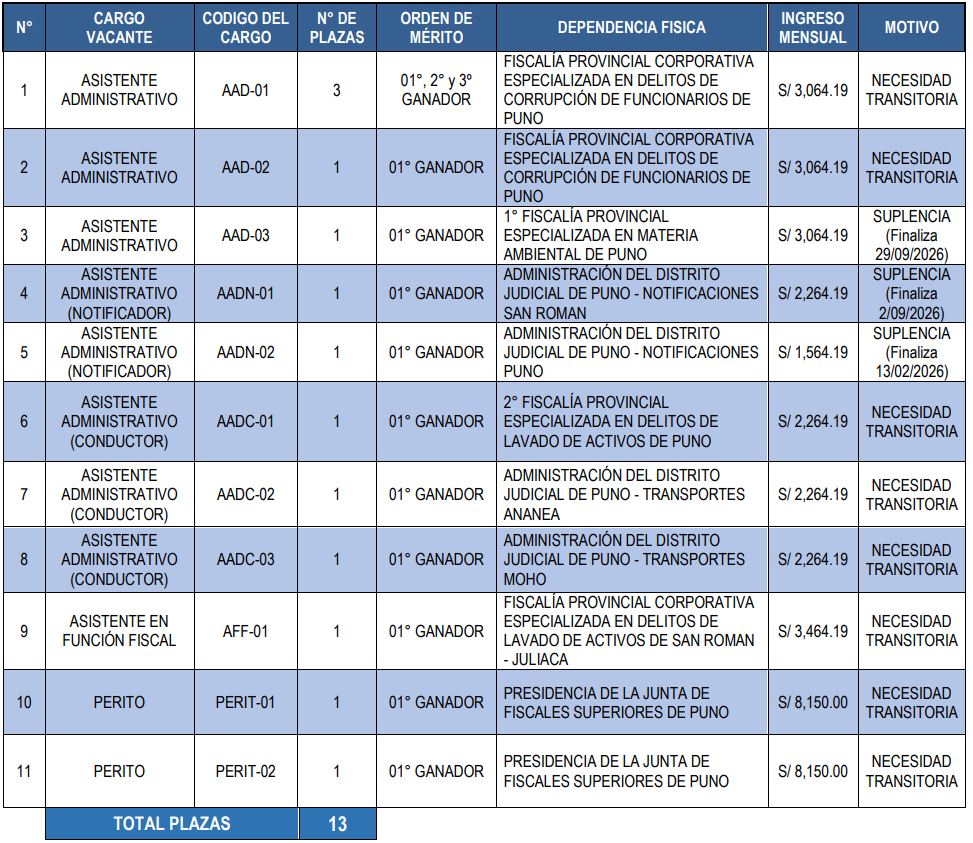 A continuación les dejamos la lista de las ofertas laborales disponibles, junto con los enlaces respectivos del Ministerio Público a cada convocatoria, donde podrán encontrar las bases y el cronograma completo. LINK PARA POSTULAR AQUÍ