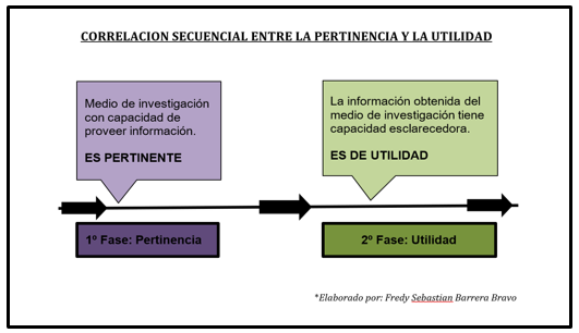 De lo expuesto se evidenciaría una correlación secuencial entre los conceptos jurídicos de pertinencia y utilidad, de tal manera, que frente a la posibilidad de disponer la realización de un medio de investigación, primero tendría que analizarse si dicho medio tiene la condición o capacidad de proveer información sobre los hechos materia de investigación, de ser afirmativo el caso, entonces estaríamos antes un medio de investigación pertinente, para recién posteriormente, analizar si el dicho medio de investigación, a través de la información que se pretende obtener, tendría también la capacidad, el potencial o la idoneidad para lograr el esclarecimiento que respecto de los hechos se pretende obtener, de ser el caso también afirmativo, entonces recién estaríamos ante una medio de investigación útil o de utilidad.