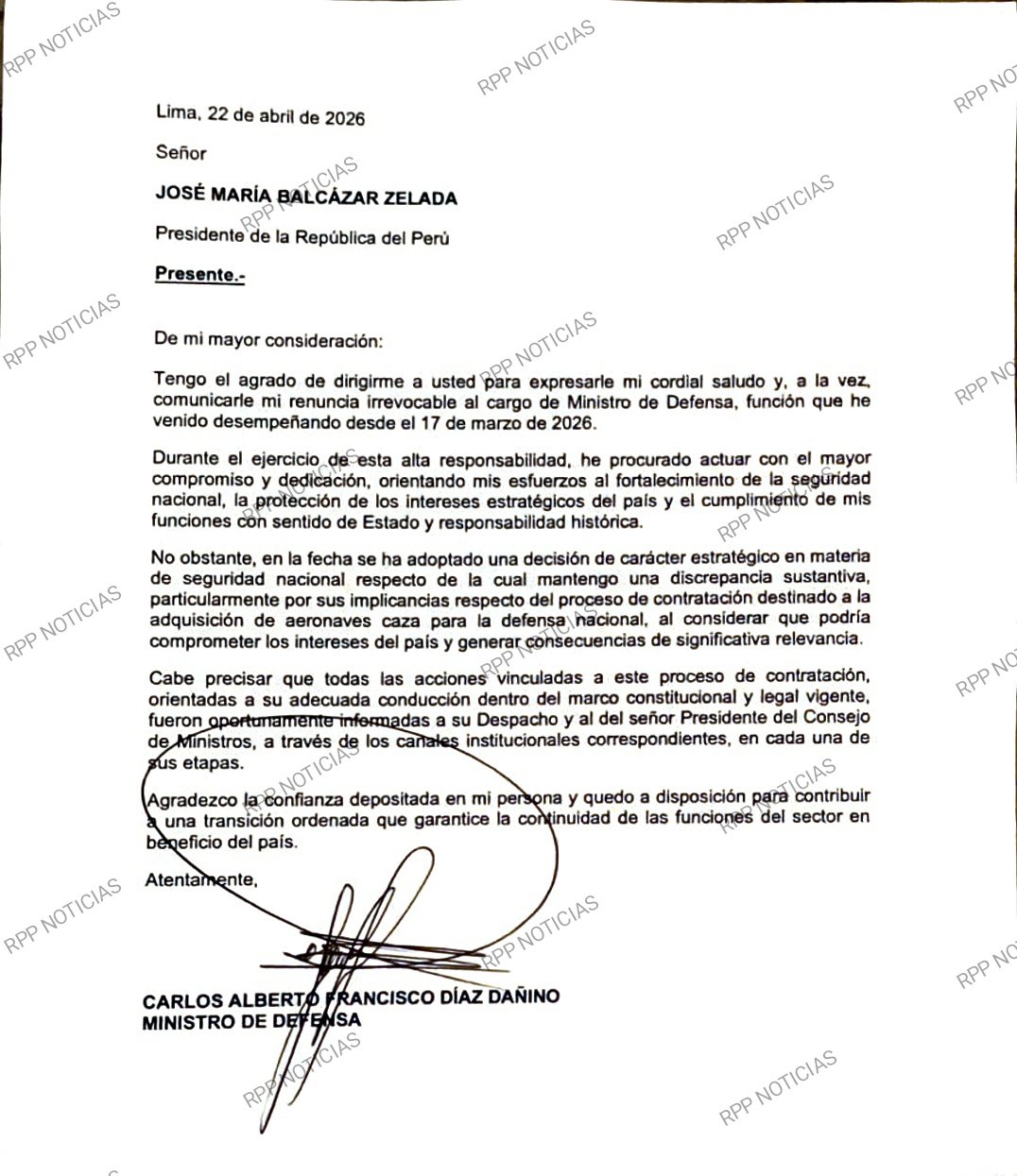En el documento, el exministro indicó que durante su gestión orientó sus esfuerzos al fortalecimiento de la seguridad nacional, la protección de los intereses estratégicos del país y el cumplimiento de sus funciones «con sentido de Estado y responsabilidad histórica». Asimismo, afirmó que actuó «con el mayor compromiso y dedicación» desde el inicio de su designación.