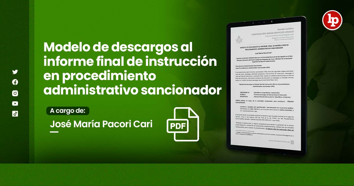 El procedimiento administrativo sancionador (PAS) tiene las siguientes etapas esenciales: acto de inicio, descargos, actividad probatoria, informe final de instrucción, descargos al informe final de instrucción y resolución final. Cuando se notifica al administrado el informe final de instrucción, este tiene el derecho de presentar sus descargos al indicado informe; este es un modelo de estos descargos (autor José María Pacori Cari).