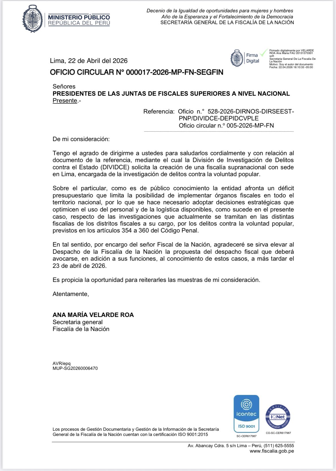 El Ministerio Público, a través de la Secretaría General de la Fiscalía de la Nación, dispuso que las presidencias de las juntas de fiscales superiores a nivel nacional remitan propuestas de despachos que asuman investigaciones por delitos contra la voluntad popular. La comunicación fue emitida mediante oficio circular del 22 de abril de 2026 y responde a un requerimiento formulado por la División de Investigación de Delitos contra el Estado (DIVIDCE).