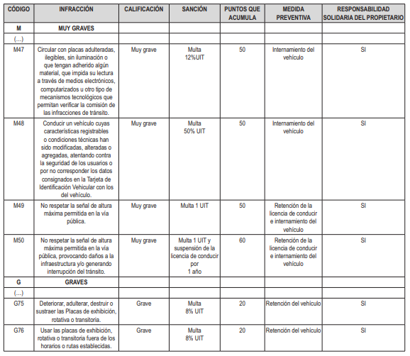 Asimismo, el decreto incorpora nuevas infracciones consideradas muy graves, como circular con placas adulteradas o ilegibles, modificar características del vehículo que afecten la seguridad, o incumplir límites de altura generando daños a la infraestructura. Estas conductas podrán acarrear multas de hasta 1 UIT, retención de la licencia e incluso la suspensión del brevete.