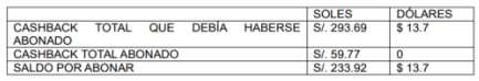 4. No obstante, BCP únicamente abonó la suma de S/ 59.77, por lo que, existe un saldo pendiente de devolución a su favor ascendente a las sumas de S/ 233.92 y US$ 13.70 dólares americanos. Finalmente, señala que el denunciado, de manera unilateral, suspendió el beneficio contractual de Cashback, bajo el argumento de haber comunicado dicha decisión mediante notificación electrónica; ello, a pesar de que las condiciones contractuales establecían el carácter permanente del referido beneficio, configurándose así una modificación unilateral y arbitraria de las condiciones pactadas.