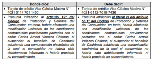 – Presunta infracción al artículo 19° del Código de Protección y Defensa del Consumidor, en tanto, habría incumplido las condiciones pactadas en el contrato suscrito con el señor XXXX, al no otorgar de forma íntegra el beneficio económico denominado «Cashback», conforme al cuadro adjunto, el cual fue ofrecido como un beneficio mensual y permanente vinculado al uso de la tarjeta de crédito Visa Clásica Masiva N° 4021-6112-****-****.