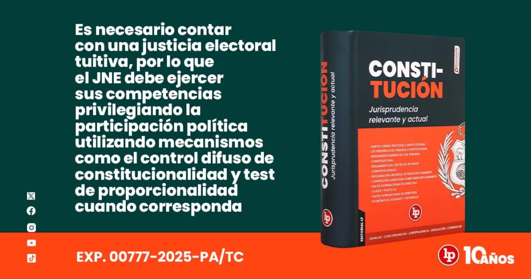 Fundamento destacado: 19. También debe recordarse que, en un reciente pronunciamiento, este Tribunal ha profundizado en la necesidad de contar con una justicia electoral tuitiva, y puso de relieve que el JNE debe ejercer sus competencias privilegiando el derecho fundamental a la participación política; y que, para tal fin, debe utilizar los mecanismos jurídicos a su disposición, tales como el control difuso de constitucionalidad y el test de proporcionalidad de derechos, cuando corresponda. Más aún cuando, en los hechos, dicho órgano termina siendo el guardián principal de este derecho fundamental, en la medida en que los pronunciamientos judiciales posteriores llegan, generalmente, en forma tardía, cuando se ha configurado la sustracción de la materia y la irreparabilidad de los derechos[24].