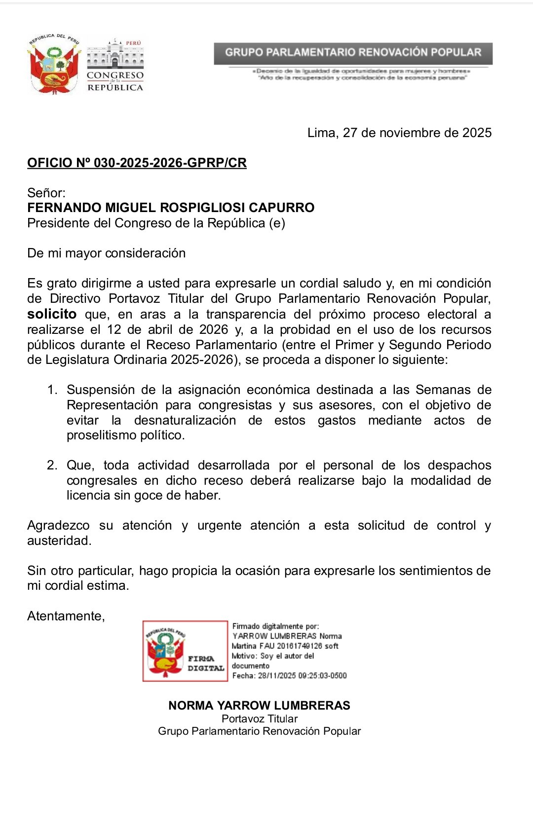 La solicitud fue formalizada mediante el Oficio 030-2025-2026-GPRP/CR, dirigido al presidente del Congreso, Fernando Rospigliosi, el 27 de noviembre. En el documento, Yarrow plantea dos medidas concretas: la suspensión de la asignación económica de las semanas de representación para congresistas y asesores, y que cualquier actividad realizada por el personal de los despachos durante el receso se ejecute bajo la modalidad de licencia sin goce de haber. Según indica, esto busca «evitar la desnaturalización de estos gastos mediante actos de proselitismo político».
