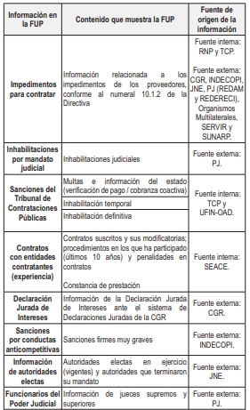 La FUP contiene información respecto de los proveedores que tengan los impedimentos previstos en el numeral 31.2 del artículo 31 de la Ley, conforme a lo siguiente: