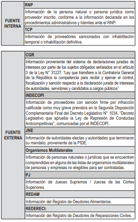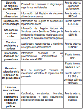 • La información establecida en el numeral 36.2 del artículo 36 del Reglamento referida a los contratos de carácter privado declarados por el proveedor, la inhabilitación administrativa por otros organismos facultados por ley, los certificados, constancias, licencias, autorizaciones y otros documentos emitidos por entidades públicas.