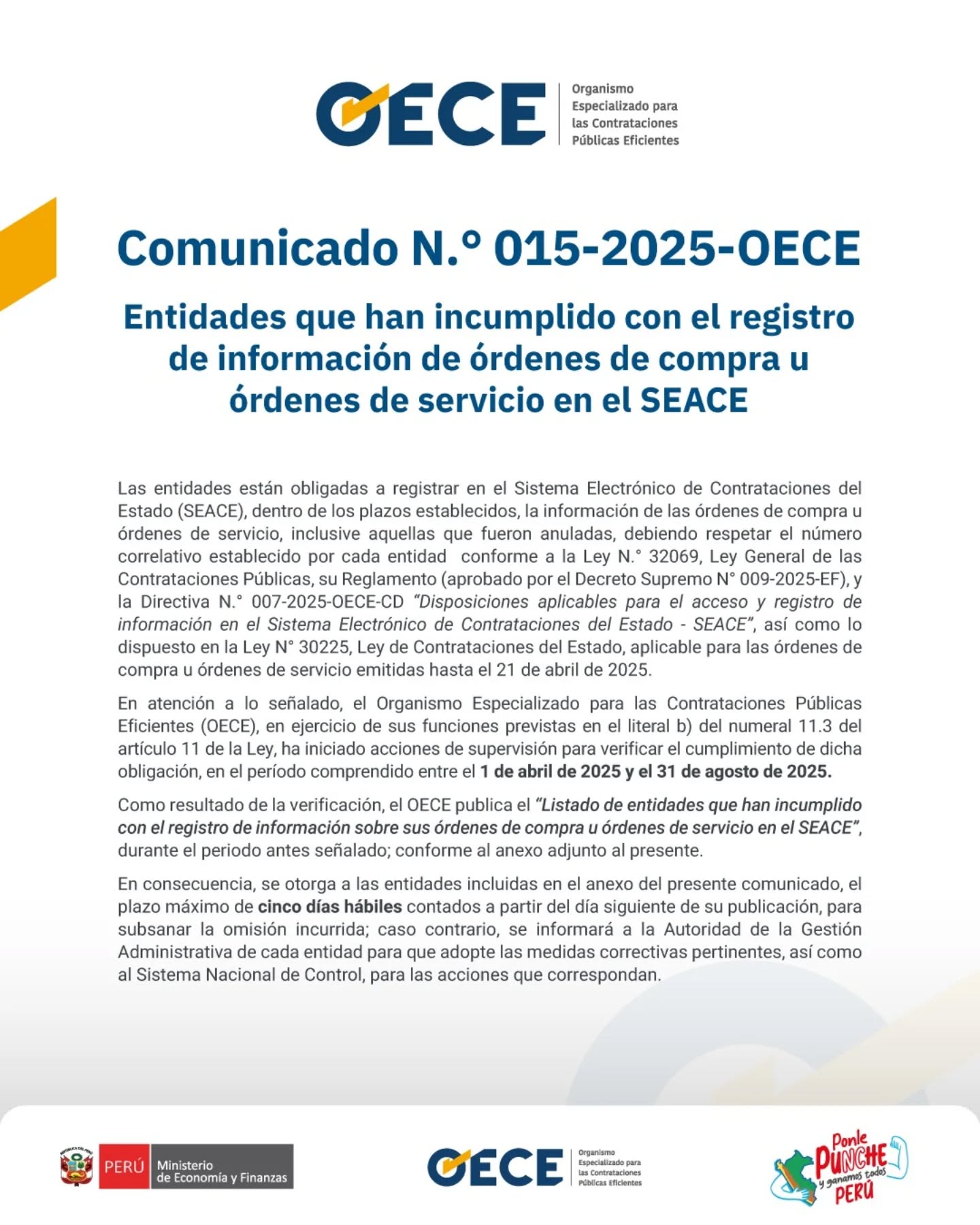 El Organismo Especializado para las Contrataciones Públicas Eficientes (OECE) publicó el listado de entidades que incumplieron con registrar sus órdenes de compra y servicio en el SEACE entre abril y agosto de 2025.