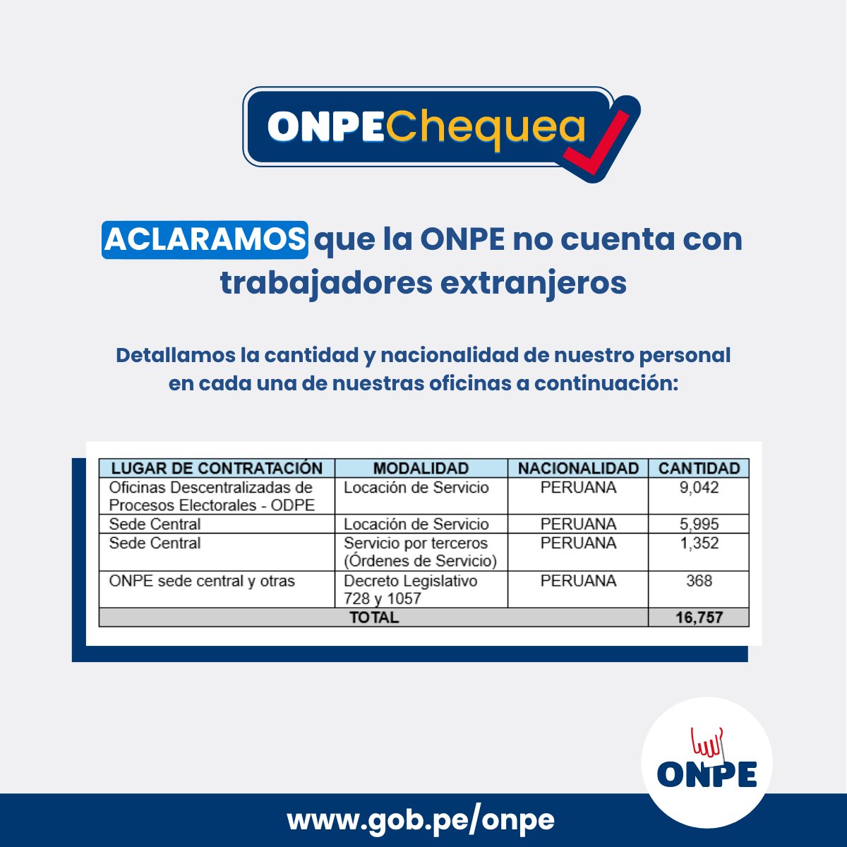 Como parte de la información difundida públicamente, la ONPE incluyó un cuadro con la distribución de su personal, en el que se precisa que todos los trabajadores son de nacionalidad peruana. Según este reporte, se contabilizan 9.042 personas en Oficinas Descentralizadas bajo locación de servicios, 5.995 en sede central bajo la misma modalidad, 1.352 bajo órdenes de servicio y 368 trabajadores en regímenes laborales de los decretos legislativos 728 y 1057.