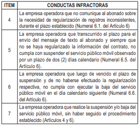 6.4. Los mensajes deben contener como mínimo, información relativa a: (a) el número telefónico del servicio observado, (b) la necesidad de regularizar la contratación de su servicio por contener información inconsistente, (c) los canales establecidos para la regularización, y (d) el plazo para realizar dicha regularización y que, en caso no se efectúe la regularización correspondiente, se procede a la suspensión y baja posterior el servicio con registro inconsistente.