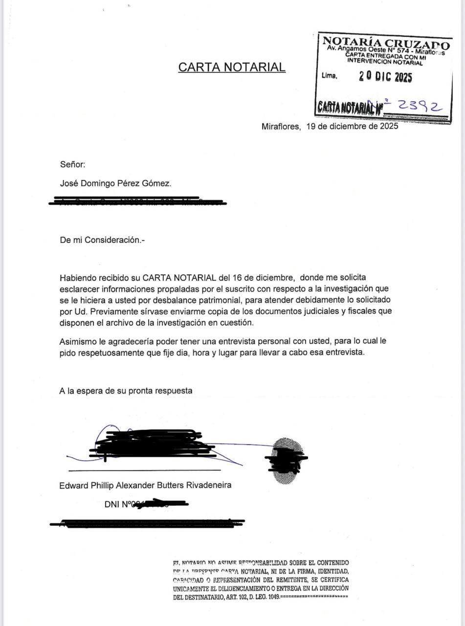La carta notarial 2392 difundida por La Encerrona, fechada el 19 de diciembre de 2025, señala que Butters recibió la comunicación enviada por Pérez Gómez el 16 de diciembre y que atenderá lo solicitado en el documento. En el texto, el conductor precisa: