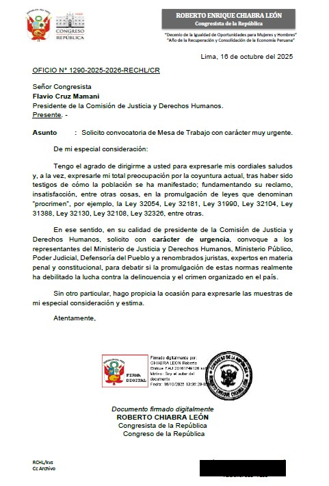 El congresista Roberto Chiabra León solicitó formalmente al presidente de la Comisión de Justicia y Derechos Humanos, Flavio Cruz Mamani, convocar de manera urgente a representantes del Estado y especialistas en derecho penal y constitucional. La finalidad sería analizar el impacto de diversas normas que, según diversos sectores, habrían debilitado la lucha contra la delincuencia y el crimen organizado.