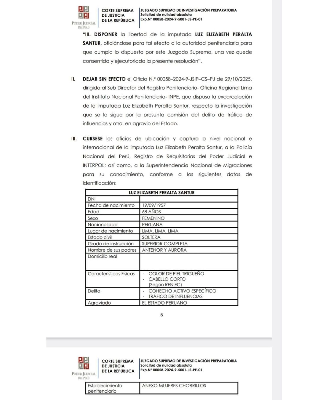 El Juzgado Supremo de Investigación Preparatoria, a cargo del juez Juan Carlos Checkley Soria, dispuso la ubicación y captura a nivel nacional e internacional de Elizabeth Peralta. La medida deja sin efecto el oficio dirigido al Instituto Nacional Penitenciario (INPE) que dispuso la excarcelación de la suspendida fiscal.