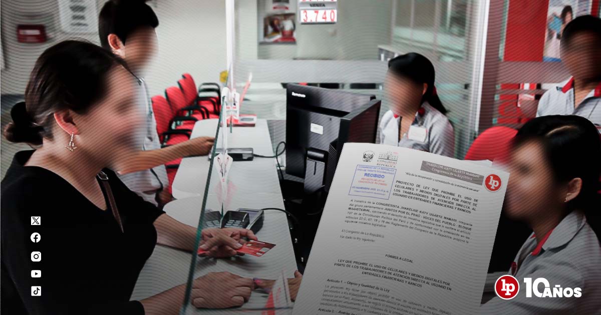 La congresista Jhakeline Ugarte Mamani (Juntos por el Perú – Voces del Pueblo – Bloque Magisterial) presentó el Proyecto de Ley 13342/2025-CR, que propone prohibir el uso de celulares y dispositivos digitales personales a los trabajadores que brindan atención directa al público en bancos y entidades financieras (cajeros).