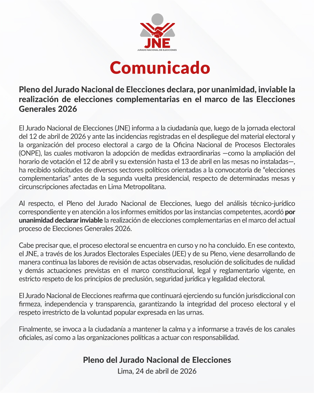 El Pleno del Jurado Nacional de Elecciones declaró por unanimidad, este viernes 24, inviable la realización de elecciones complementarias en el marco de las Elecciones Generales 2026. En el comunicado, la entidad resaltó que el proceso electoral «se encuentra en curso y no ha concluido».