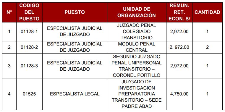 Objeto de la Convocatoria: El Comité de Selección de Personal Ad Hoc de la Corte Superior de Justicia de Ucayali, pone en conocimiento el proceso de selección de personal que se llevará a cabo para cubrir cuatro (04) posiciones CAS, bajo el Decreto Legislativo N°1057 (CAS), conforme se detalla a continuación: